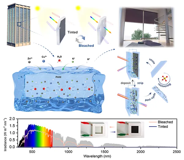 准固态铜锌双金属可逆电沉积智能窗工作机制与光热调控示意图